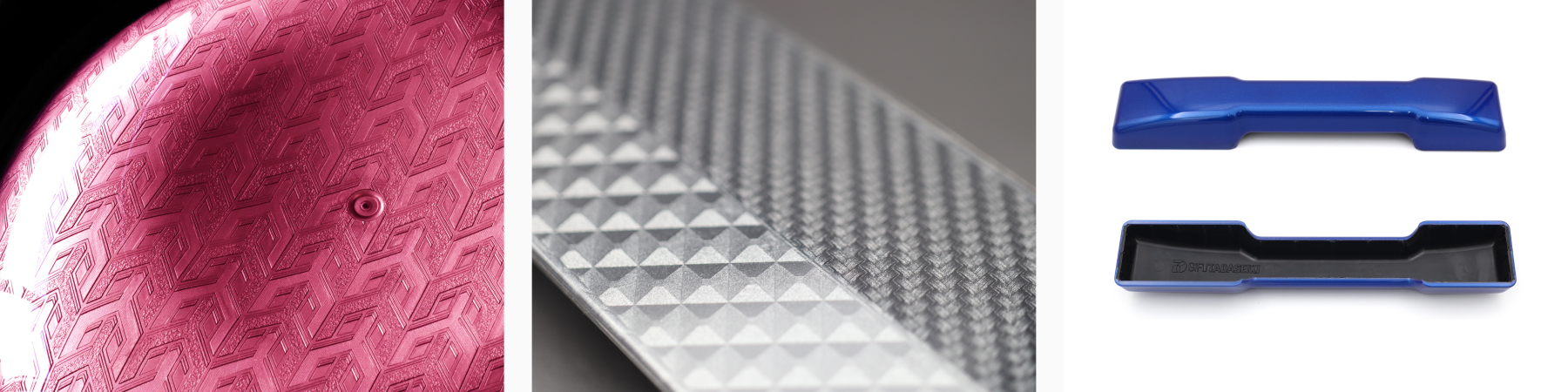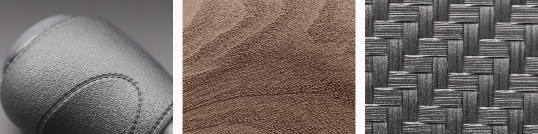 高精細なCGデザインソフトを活用し、革、布、木目、CFRP(炭素繊維強化プラスチック)などの模様を革張りのシワやステッチに至るまでリアルに再現。最先端のレーザー加工機で金型へ彫り込み、素材の持つ質感を最大限に引き出します。従来の加飾方法では難しかった複雑な曲面にも対応可能です。